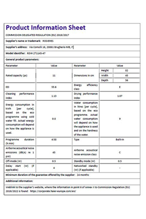 - Consommation d'eau 9 L/cycle - Classe énergétique E