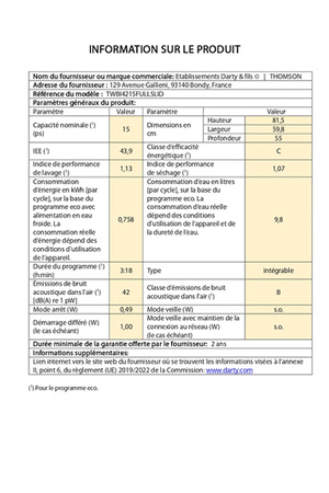 - Consommation d'eau 9.8 L/cycle - Classe énergétique C