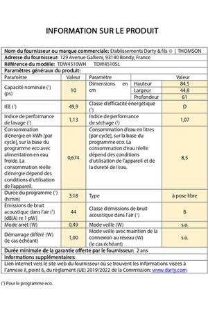 - Consommation d'eau 8.5 L/cycle - Classe énergétique D