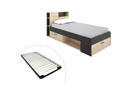 Lit 2 Places Avec Tête De Lit Rangements Et Tiroir - 90 X 190 Cm - Anthracite Et Naturel + Sommier - Leandre