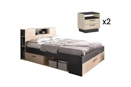 Lit 2 Places Avec Tête De Lit Rangements Et Tiroirs - 140 X 190 Cm - Coloris : Naturel Et Anthracite + Chevets - Leandre