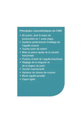 Machine à coudre Brother Innov-is A80 - Garantie 5 ans L'innov-is A80 vous offre la liberté de coudre quand, comment et où bon vous semble ! Légère, elle est livrée avec un capot rigide, vous pourrez