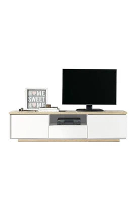 Meuble TV coloris Blanc / Chene Cambrian equipe de 2 portes, 1 niche et 1 tiroir, fabrique en panneaux de particules melamines de haute qualite. Tiroirs avec glissieres metalliques. Produit de fabrication Espagnole. Meuble livre en kit. Facile a nettoyer. Dimensions : longueur 183 x profondeur 35 x hauteur 46 cm