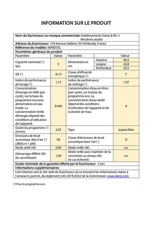 - Largeur 43 cm (3 couverts) - 58dB (classe sonore D)
