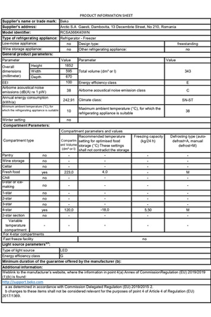 - Volume 343 L - Dimensions (H-L-P) 185.2x59.5x67 cm - Classe E - 38dB